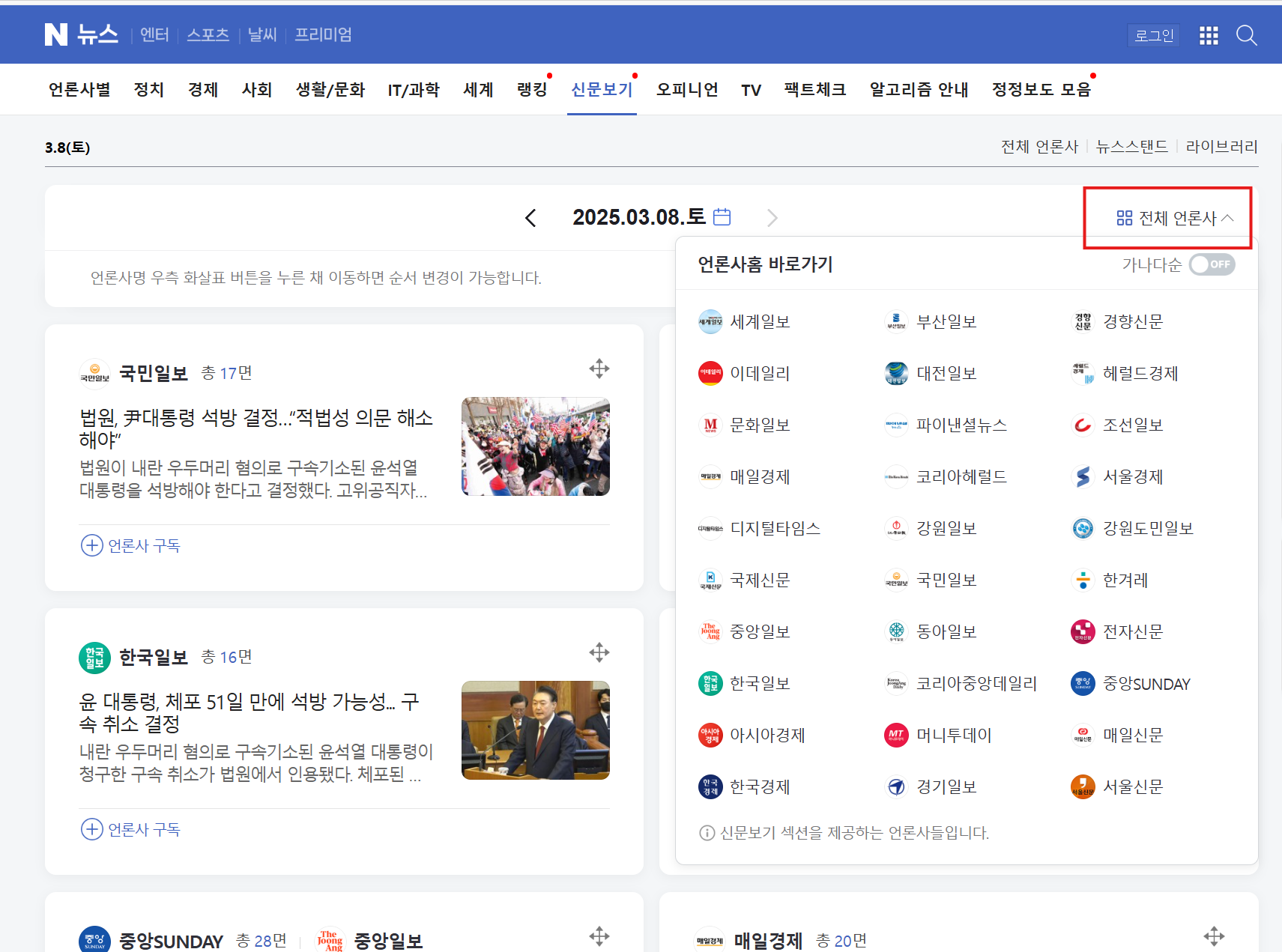우측 상단에 [전체언론사] 클릭 하면 언론사들이 좌르륵~ 나옵니다.