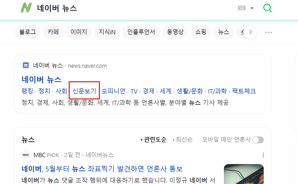 네이버 뉴스로 검색된 화면에서 [신문보기] 클릭!